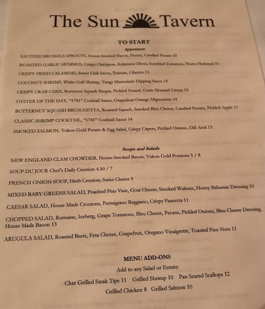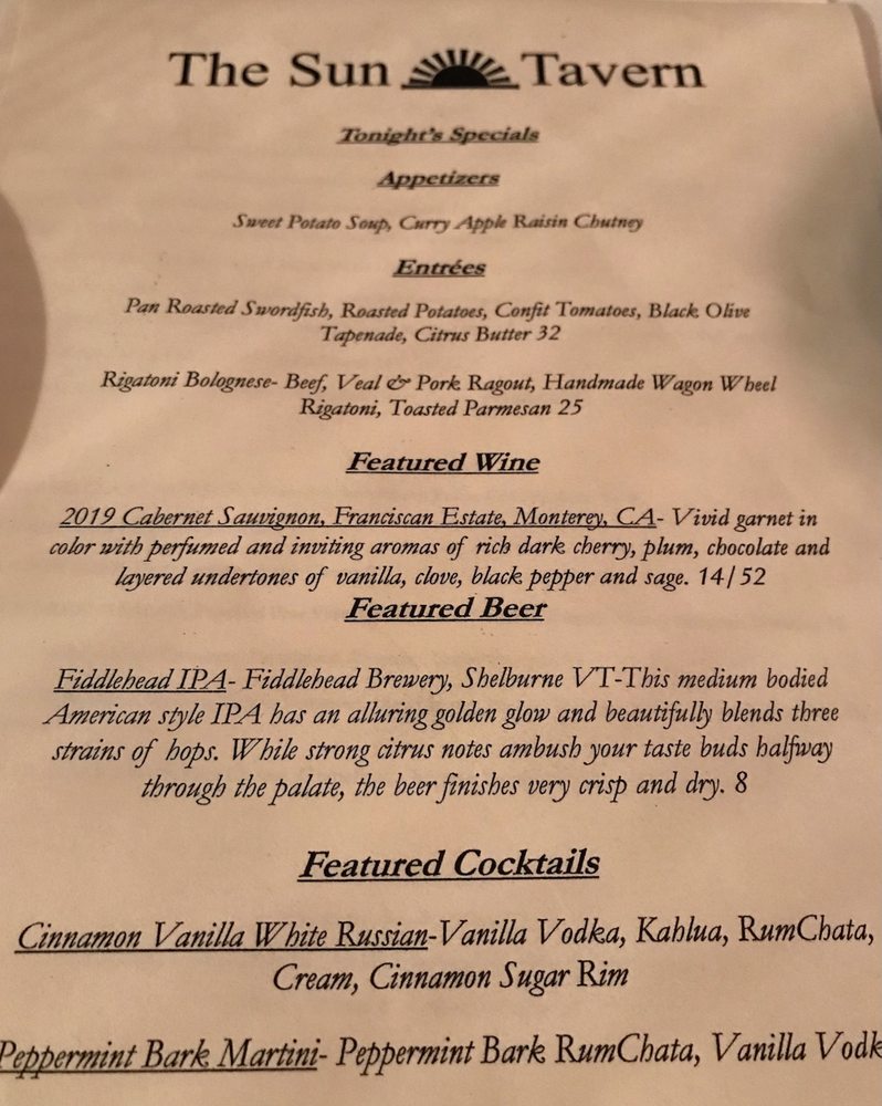 The Sun Tavern, a New American steakhouse in Duxbury, MA, offers a classy dining experience with a variety of amenities like outdoor seating, full bar, and private dining options. The menu features delectable starters like sautéed Brussels sprouts with house-smoked bacon and crispy fried calamari with sweet chili sauce. For main courses, indulge in barrel-cut filet mignon or sweet chili BBQ marinated steak tips. Customers rave about the quality and variety of dishes, with seasonal updates and ingredients sourced from their own garden. The charming historic setting and attentive staff, like waitress Sasha, create a memorable dining experience. Whether you're looking for a cozy dinner spot or a vibrant bar scene, The Sun Tavern delivers on delicious food and excellent service.